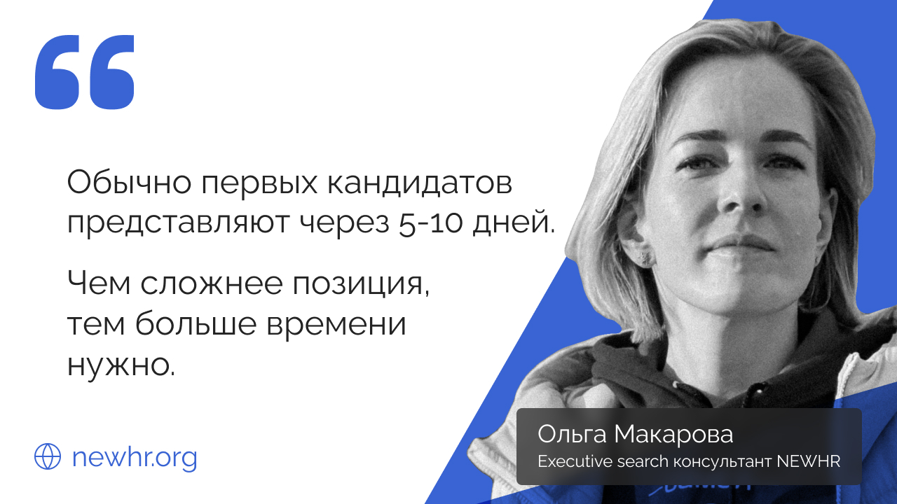 «Например, есть предварительный этап работы с вакансией. За это время рекрутеры находят первых подходящих кандидатов, общаются с ними и оценивают. Агентство предупреждает клиента о том, сколько займёт предварительный этап. Обычно первых кандидатов представляют через 5–10 дней. Чем сложнее позиция, тем больше времени нужно», — говорит executive search консультант NEWHR Ольга Макарова.